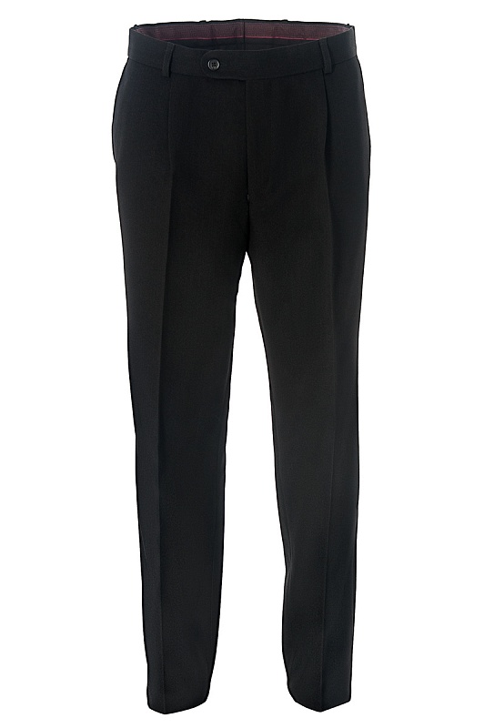 Черные классические брюки слегка зауженного кроя. Модель без защипов, посадка низкая. По бокам удобные карманы с отделочной сточкой, сзади два кармана . Выполнены из плотной ткани с фактурной полоской.