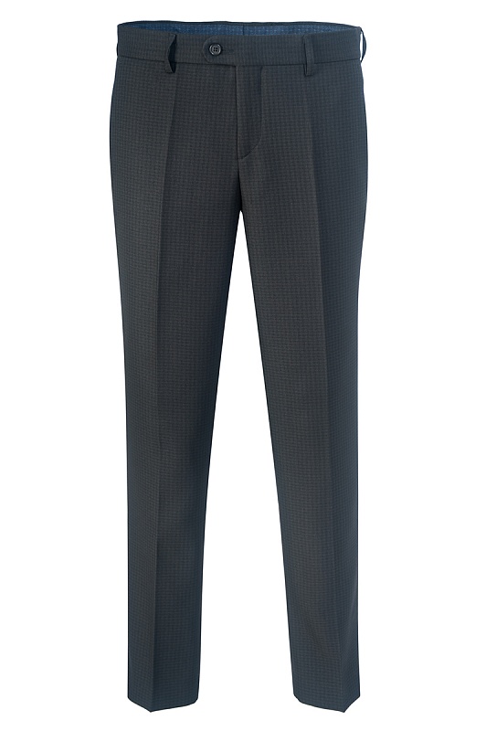 Брюки классические слегка зауженные. Линия посадки пояса брюк немного ниже естественной линии талии. Боковые карманы с отрезными бочками. На заднех правой и левой частях брюк располагаются два прорезных кармана с <<листочкой>>. Передние части брюк на подкладке.